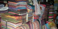 Textiles : Silk weaving in Cambodia has a long history. The practice dates to as early as the first century, and textiles were used in trade during Angkorian times. Even modern textile production evidences these historic antecedents: motifs found on silk today often echo clothing details on ancient stone sculptures. Weavers today form sophisticated patterns of birds and flowers, mythical and realistic, often depicting Khmer tales, scenes from Angkor Wat, and the life of Lord Buddha. They produce a style of intricately patterned and dyed silk called "Kha Bang Neang Sok Kra Ob". There are two main types of Cambodian weaving. The ikat technique (Khmer: Chong Kiet), which produces patterned fabric, is quite complex. To create patterns, weavers tie and dye portions of weft yarn before weaving begins. The second weaving technique, unique to Cambodia, is called "uneven twill". It yields single or two-color fabrics, which are produced by weaving three threads so that the color of one thread dominates on one side of the fabric, while the two others determine the color on the reverse side. Natural dyes made from plants are traditionally used. Red dye comes from lac insect nests, blue dye from indigo, yellow and green dye from Prohut bark, violet dye from violets, and black dye from ebony bark. Designs incorporate images of flowers, animals, peacocks, crowns, jewels, and other motifs inspired by the Angkor era, or handed down from previous generations. The first technique involves wrapping strands of raw silk on to a frame, and then tying the strands with banana-leaf threads into patterns. The silk is removed, dyed, and remounted on the frame to be re-tied for the other colors in the pattern, up to five times. Base color silk is strung lengthwise on to the loom. The dyed threads are the wefts, the crosswise threads, woven into the pattern originally created by the tie-dying process. It takes a week to string the warp threads onto the loom, and a week to weave a length of silk for a Sarong. Various silk products include checkered Sarong and Sampot worn at home, patterned Hol and Phamuong worn on formal occasions, furnishings decorated for informal/ formal ceremonies, and Pidan (pictorial tapestries) used as household beauties. Silk weaving can be seen in Koh Sotin District, Kampong Cham Province; Kean Svay District, Kandal Province; Bati and Prey Kabas Districts, Takeo Province; Prèk Changkran District, Prey Vèng Province; and Prèk Luong and Koh Dach Districts, Kandal Province. Cambodia's modern silk-weaving centers providing employment for many rural women are Takeo, Battambang, Beanteay Meanchey, Siem Reap and Kampot provinces. Cotton textiles have also played a significant role in Cambodian culture. Traditionally woven cotton remains popular. Rural women often weave homemade cotton fabric, which is used in garments and for household purposes. Krama, the traditional check scarves worn almost universally by the Cambodian, are made of cotton. Non-textile Weaving : Many Cambodian farmers weave baskets (Khmer: Tbanh Kantrak) for household use or as a supplemental source of income. Most baskets are made of thinly cut bamboo. Regions known for basketry include Siem Reap and Kampong Cham. Mat weaving (Tbanh Kantél) is a common seasonal occupation. They are most commonly made from reeds, either left a natural tan color or dyed in deep jewel tones. The region of Cambodia best known for mat weaving is the Mekong floodplain, especially around Lvea Em district. Mats are commonly laid out for guests and are important building materials for homes. Wicker and rattan crafts (Tbanh Kanhcheu) are also significant. Common wicker and rattan products include walls, mats, furniture, and other household items.