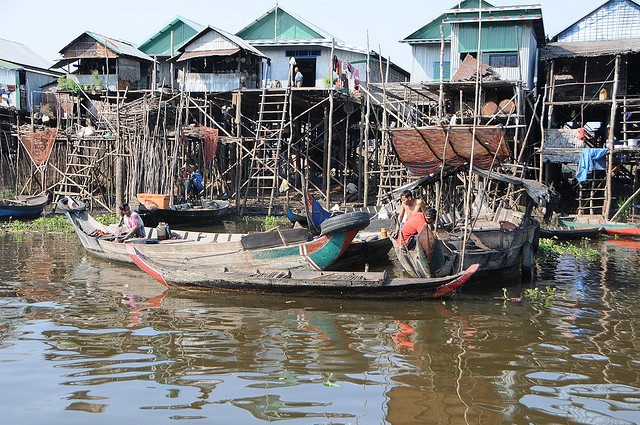 Kampong PhlukKampong Phluk is a cluster of three villages of stilled houses built within the floodplain of the Tonle Sap about 25km southeast of Siem Reap. It is a floating village on the Tonle Sap lake. The name means “harbor of the tusks”. Flooded mangrove forest surrounds the area and is home to a variety of wildlife including crab-eating macaques. During the dry season when the lake is low, the buildings in the villages seem to soar atop their 6-meter stilts exposed by the lake of water. At this time of year many of the villagers move out onto the lake and build temporary stilted houses. In the wet season when water level rises again, the villagers move back to their permanent houses on the floodplain, the stilts now hidden under the water. Kampong Phluk`s economy is as one might expect, based in fishing, primary in shrimp harvesting. Tourists also can take a canoe through flooded forest.