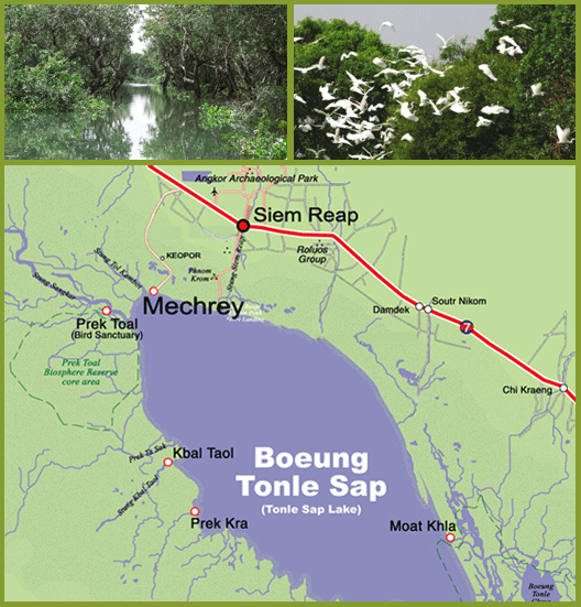 MechreyMechrey Natural Tourism is located in Peam Ta Our village, Keo Por Commune, Puok District, Siem Reap; 15 km on the south west of Siem reap. Just only 25 minutes drive, you will arrive at ancient-built port waiting to board the tourists on the boat to discover the attractive nature along the waterway. With one and a half hour exploration round trip, at first you will see a floating village where hundreds of families earn their living depending entirely by fishing in a traditional way by making 2 dollars a day in average. When you go further, there is an old pagoda constructed in 1964 on 2700 m2 island engulfed with water and a stopover to take photos of surrounding natural beauty such as floating houses, traditional fishing, people living, and children rowing boat to school. To travel further, you will go through an impressive flooded forests stretching over 24 km2. The forest is a habitat of hundreds types of fish and waterbirds and from November to May, hundreds of waterbirds will come to this area to look for foods as it is a safe and full of proteins for those birds, especially this area is only 6 km from Conservation of Prek Toal Bird Sanctuary, where thousands of waterbirds live and breed. Visiting and Experiencing this newly discovered natural tourist Mechrey will help improve people living standard in the area, where formerly the area is a tug of war battle and no one ever take a look after peace prevail in the area..
